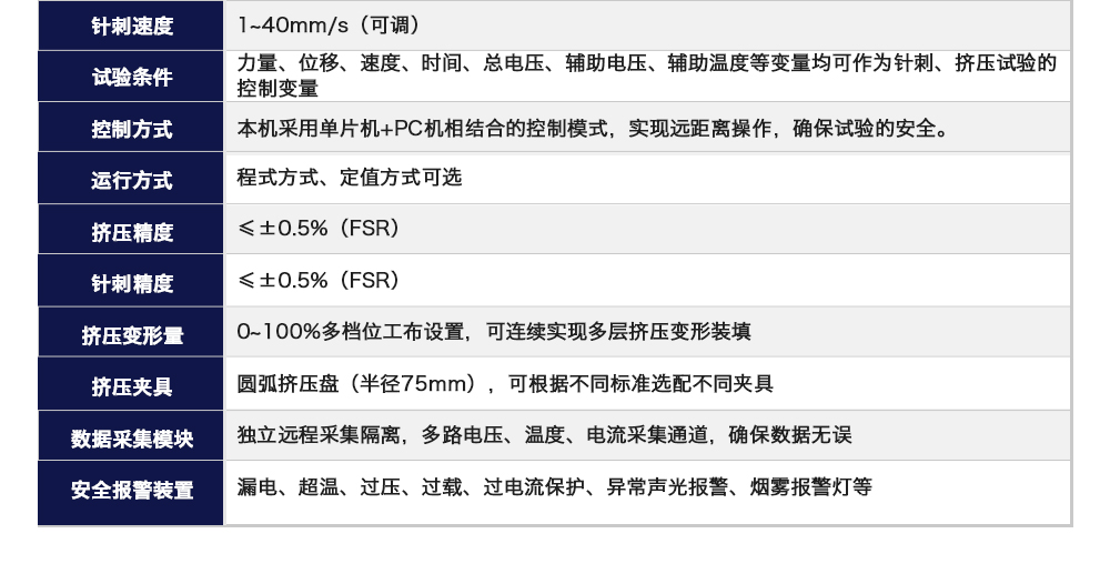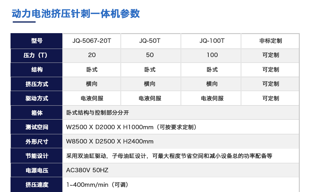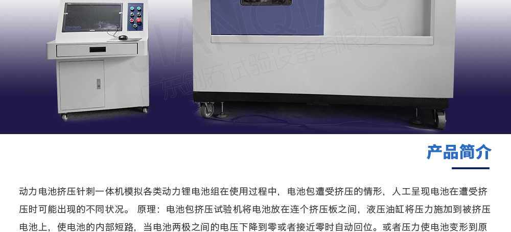 用途:動(dòng)力電池?cái)D壓針刺一體機(jī)模擬各類動(dòng)力鋰電池組在使用過(guò)程中,電池包遭受擠壓的情形,人工呈現(xiàn)電池在遭受擠壓時(shí)可能出現(xiàn)的不同狀況。 原理:電池包擠壓試驗(yàn)機(jī)將電池放在連個(gè)擠壓