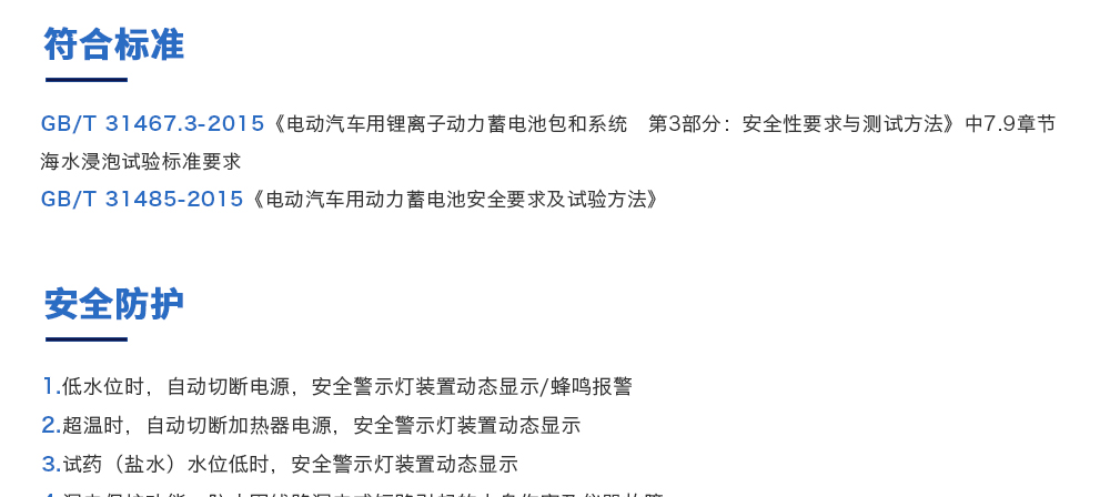 用途:海水浸泡試驗裝置主要用于電池以實車裝配狀態與整車線束相連然后以實車裝配方向在常溫下的海水成分中浸泡2h(海水為模擬海水成分,濃度為3.5%NaCl溶液)水槽中海水深度要足以淹