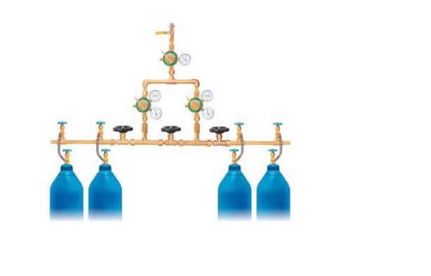 中心供氧系統匯流排的組成部分有兩種,一根是左匯流主管道,另一根是右匯流主管道,中間有四只高壓閥門,分別控制左右兩組匯流管,每組有相當數量的分閥,軟管及卡具連接氣瓶,中間裝有一塊高壓表,用來檢測匯流管內的壓力,高壓閥門上方分別有兩組減壓器,以便控制調節使用壓力及流量。