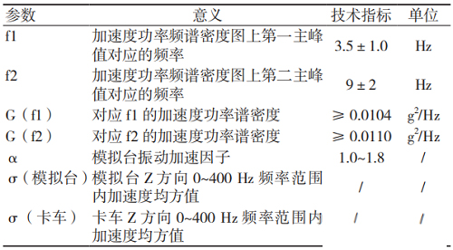 模擬運(yùn)輸臺的設(shè)計(jì)參數(shù)主要依據(jù)《QJ/T 815.2-94產(chǎn)品公路運(yùn)輸加速模擬試驗(yàn)方法》[3]設(shè)定。該標(biāo)準(zhǔn)中規(guī)定了模擬運(yùn)輸臺的關(guān)鍵技術(shù)指標(biāo),見表1。