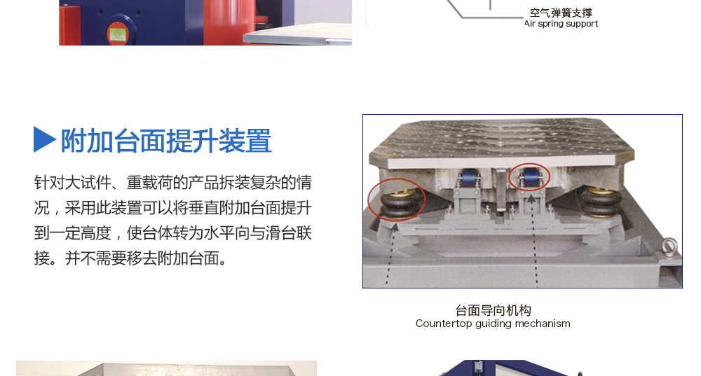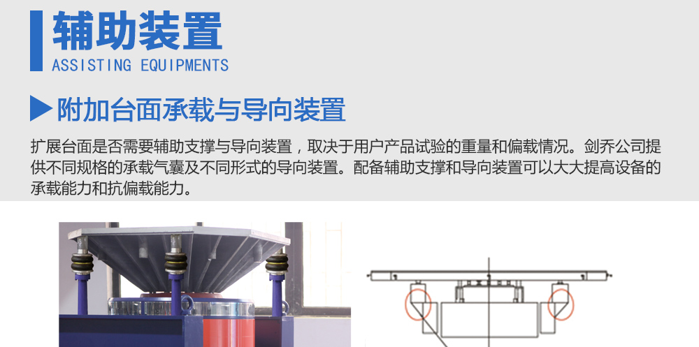 用途:擴(kuò)展臺面是否需要輔助支撐與導(dǎo)向裝置,取決于用戶產(chǎn)品試驗的重量和偏載情況。劍喬公司提供不同規(guī)格的承載氣囊及不同形式的導(dǎo)向裝置。配備輔助支撐和導(dǎo)向裝置可以大大提高設(shè)備的承載能